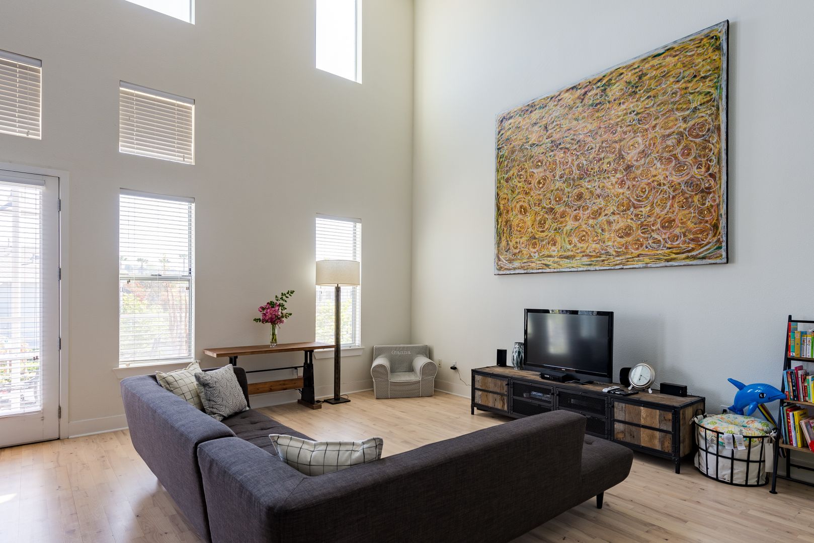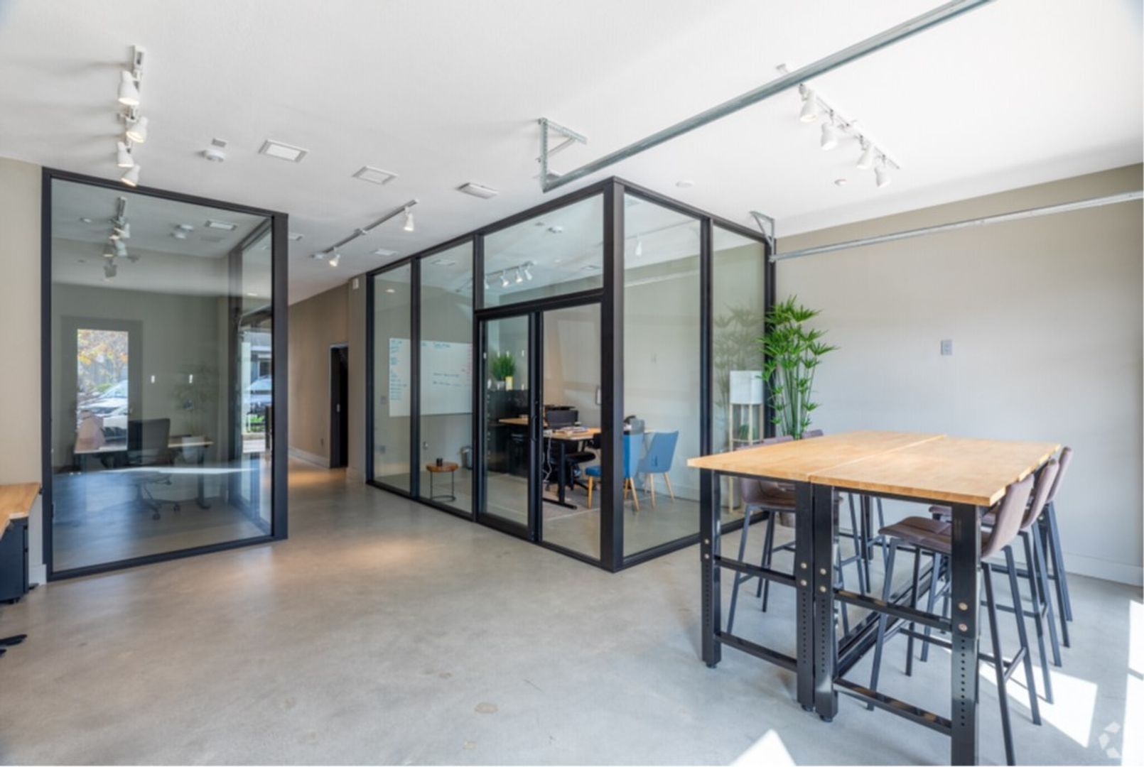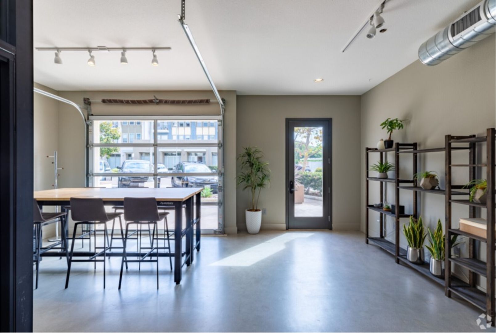 Spacious live/work unit with 1,100 square feet of ground floor commercial space, situated beneath 2 floors of loft style residential space. This unit has modern grey cabinets and white quartz countertops. The space also includes upgraded features such as keyless door locks, dedicated high-speed fiber internet, and automatic lighting.