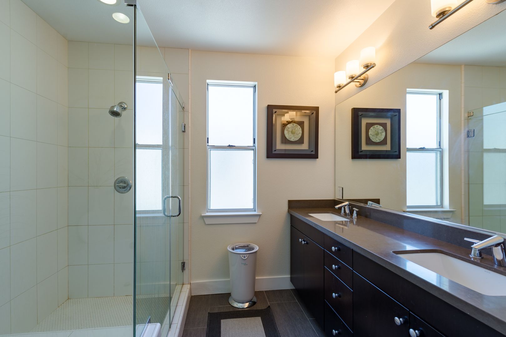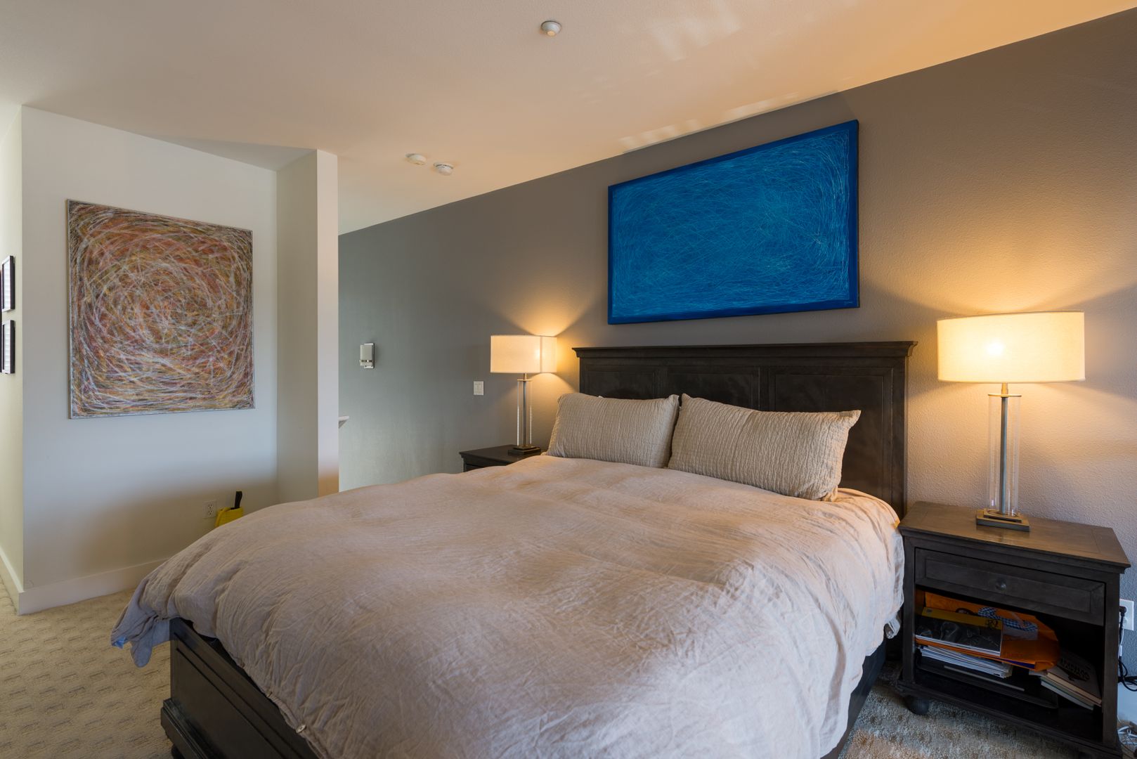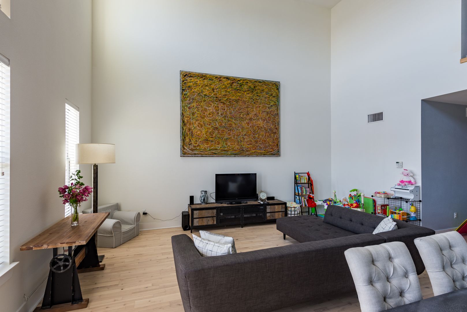 Spacious live/work unit with 1,100 square feet of ground floor commercial space, situated beneath 2 floors of loft style residential space. This unit has modern grey cabinets and white quartz countertops. The space also includes upgraded features such as keyless door locks, dedicated high-speed fiber internet, and automatic lighting.